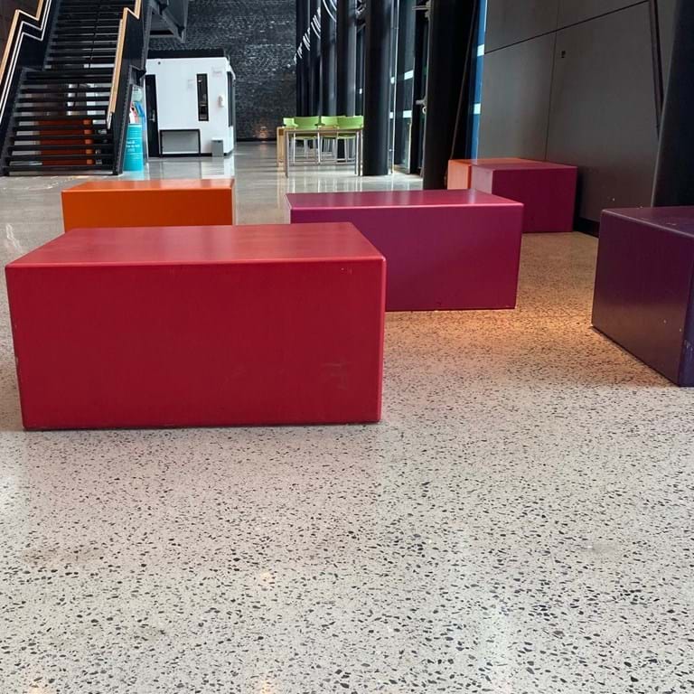 I 2013 leverte vi betong til store flater i oppholdsrommene på Kuben Videregående Skole. Det er lys betong med stein fra Kilemoen. Gulvet fremstår like flott i dag selv om tusenvis av ben hver uke tråkker over gulvene.