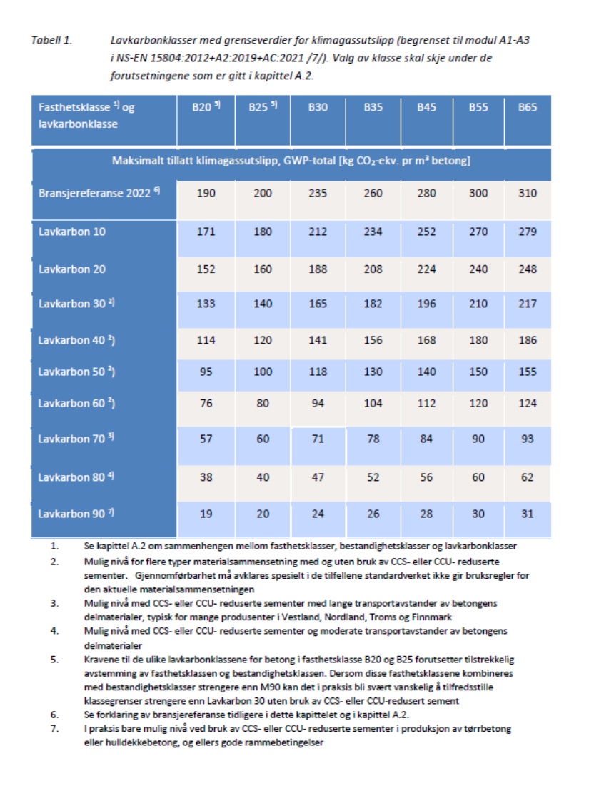 Publikasjon NB 37 definerer klassegrenser for klimagassutslippet for lavkarbonbetong, der grensene tilsvarer en prosentvis reduksjon i forhold til bransjereferansen for hver fasthetsklasse.